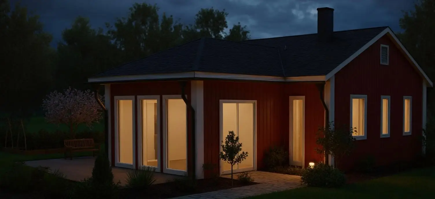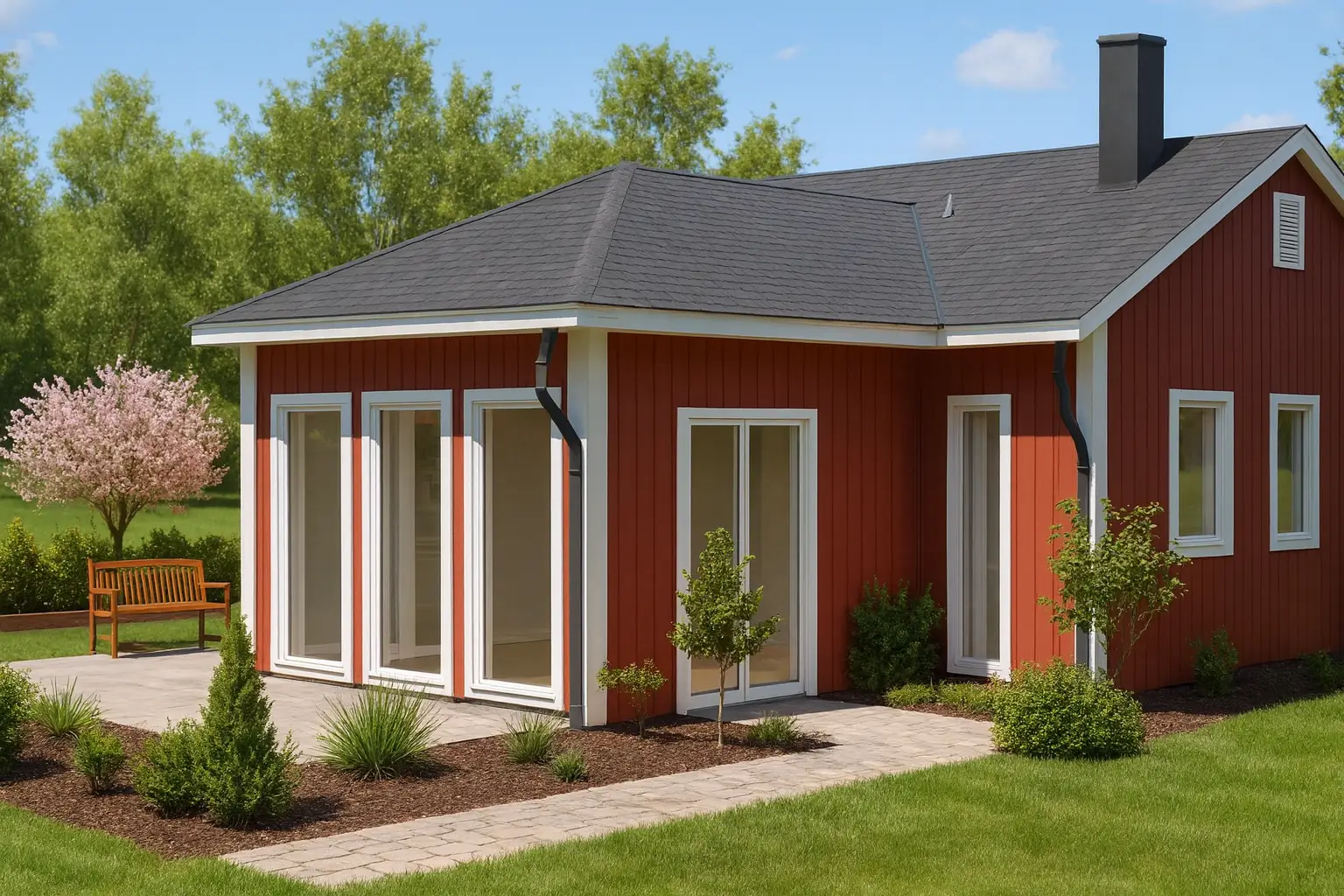 Huset består av bergslagspanel, vita knutar, vita foder, härliga höga fönsterpartier för ett vackert ljusinsläpp med utsikt mot sjön, svart tegeltak, svart skorsten och svarta stuprännor.