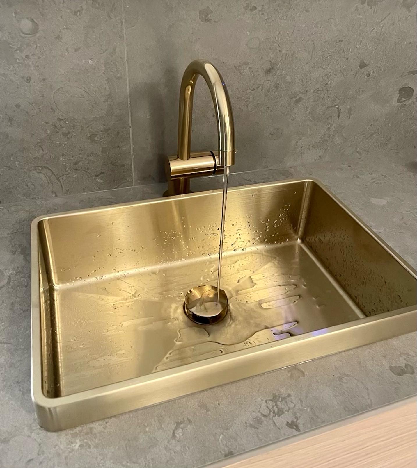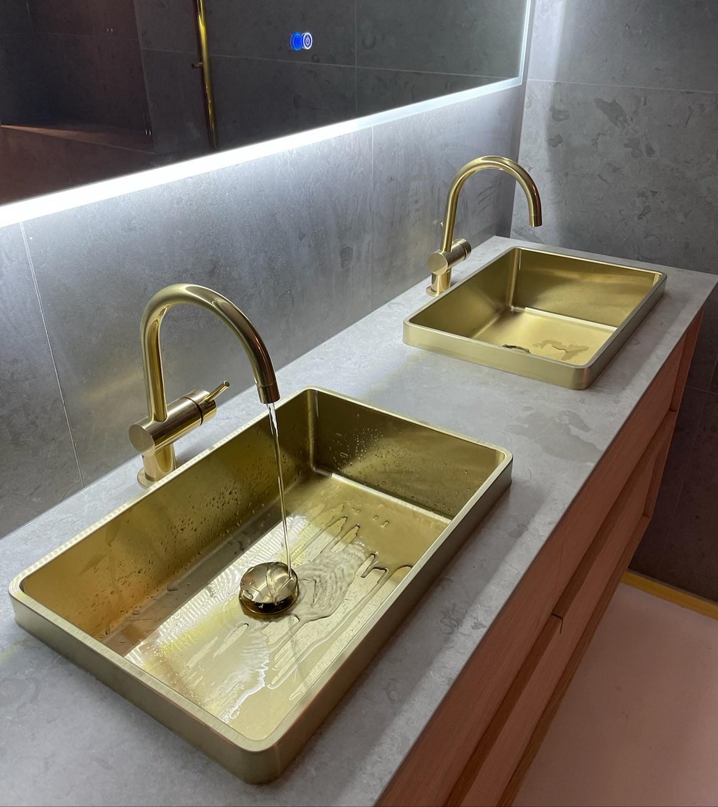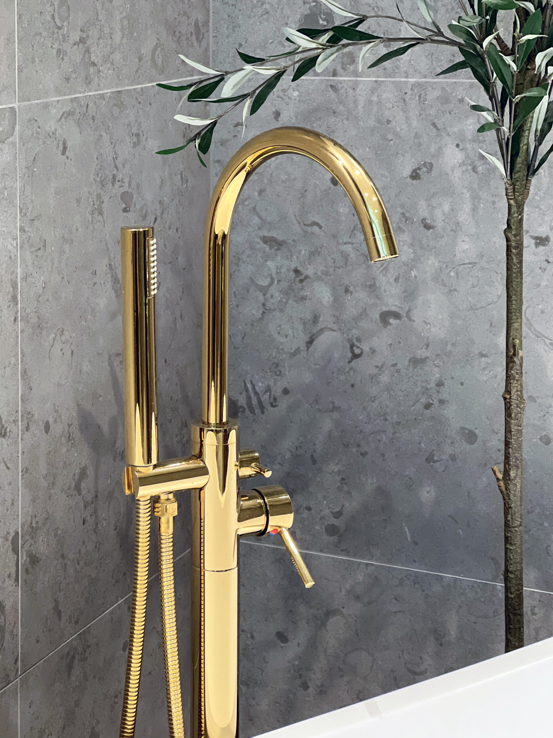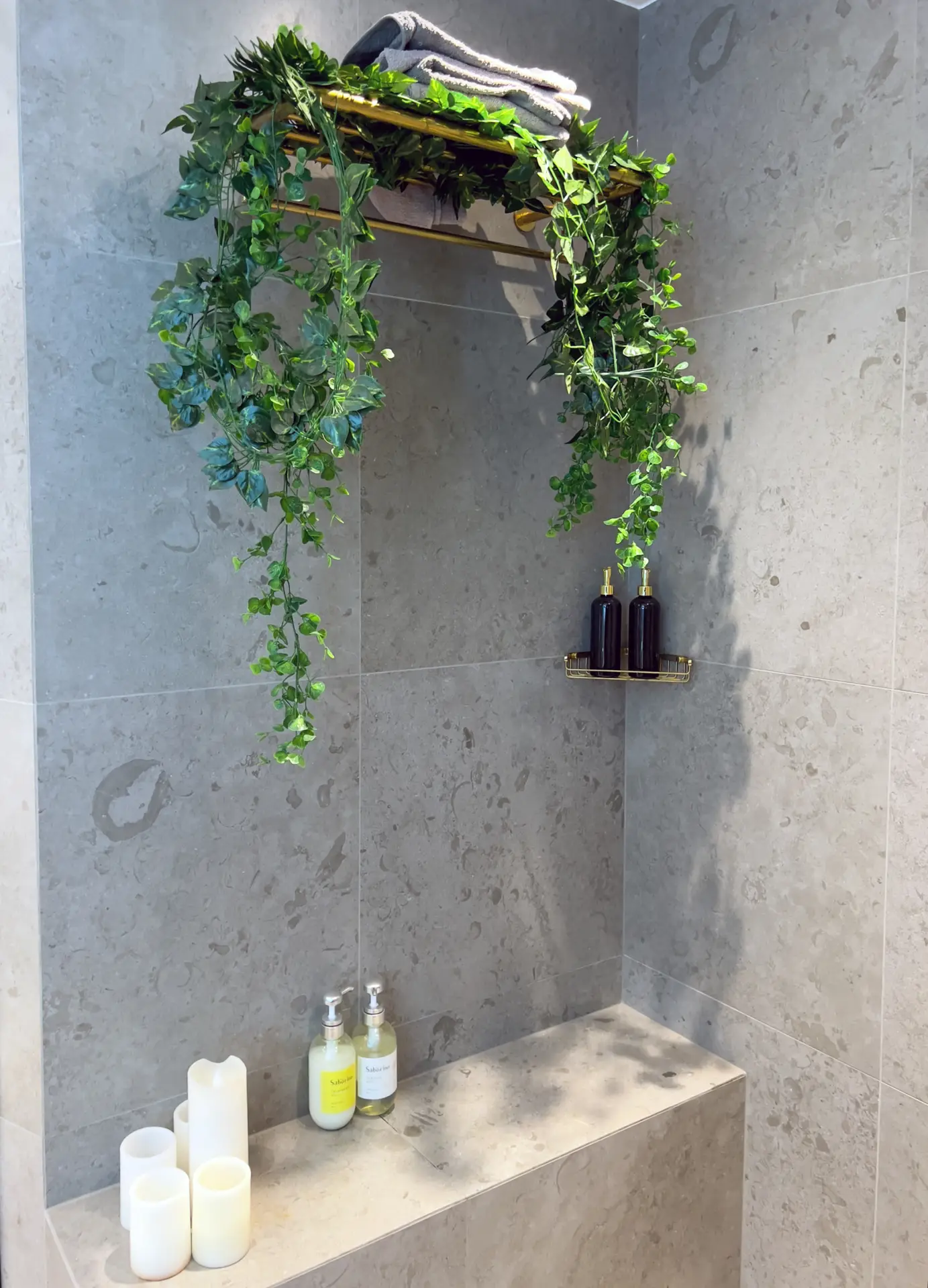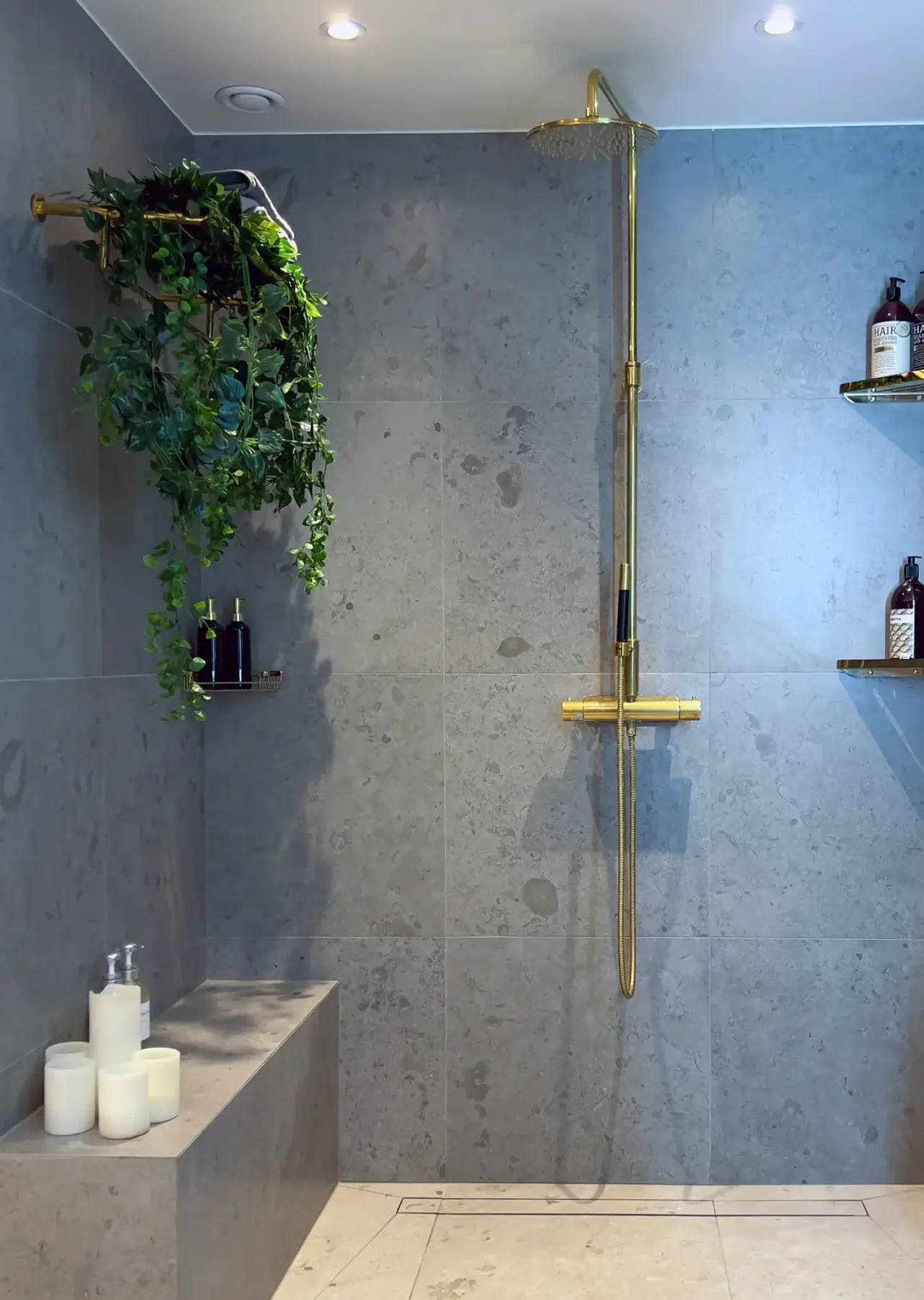 Ett badrum som bjuder in till lugn och avkoppling – där natursten från Bricmate, mässingsdetaljer och inslag av grönska samspelar i en harmonisk helhet.