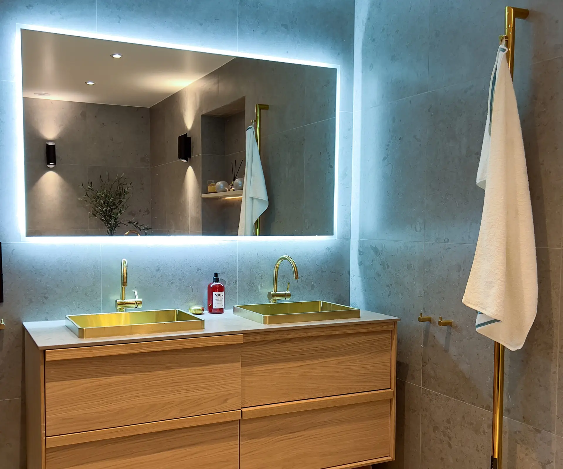 Det fristående badkaret blir rummets naturliga blickfång, medan den dolda belysningen framhäver stenens karaktär och skapar en exklusiv spa-känsla hemma.