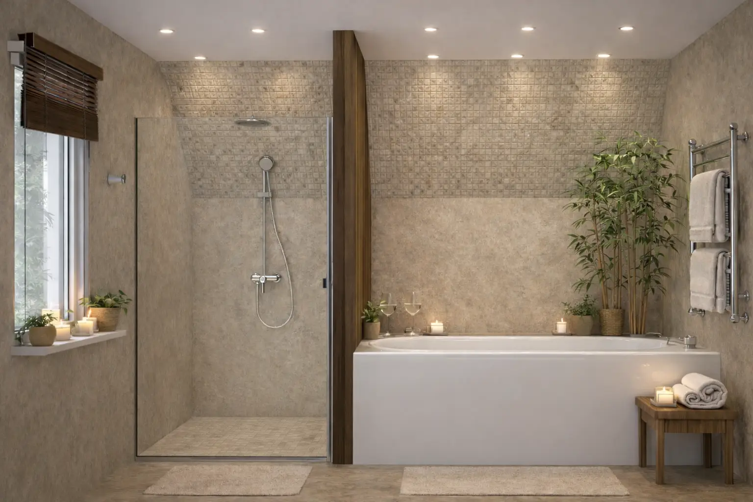 Här möts ett exklusivt massagebadkar från Nordhem med stilren inredning från HTH, en kombination som andas både komfort och kvalitet. De varma, naturliga tonerna i kakel och klinker från Höganäs ramar in rummet och skapar en lugn, spa-lik känsla.