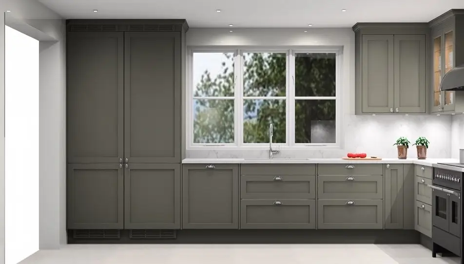 Skåpen med enkel ram och rena linjer stärker kökets klassiska och eleganta stil och skapar en känsla av balans och harmoni.