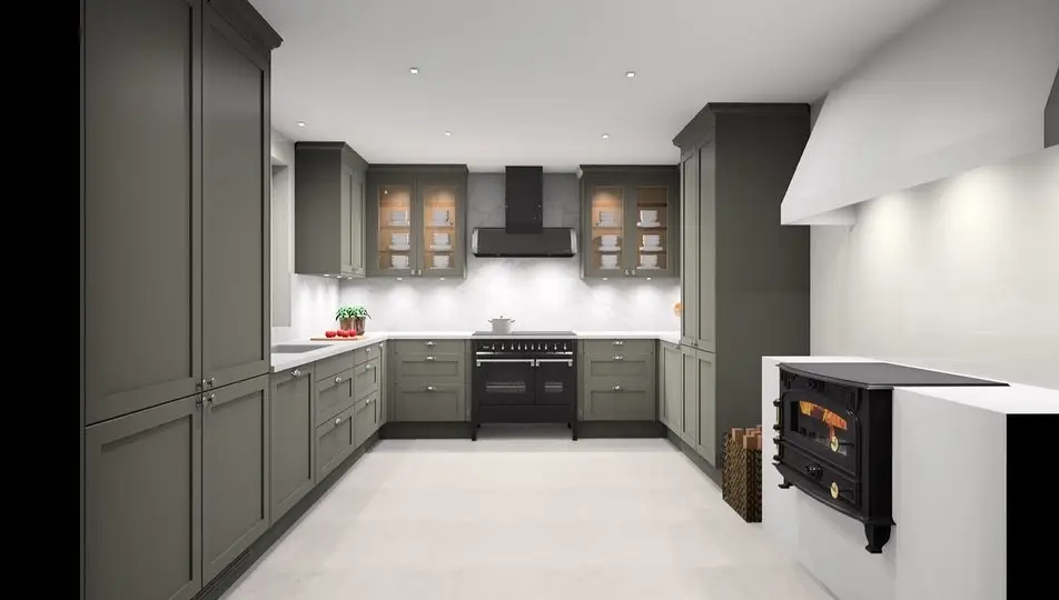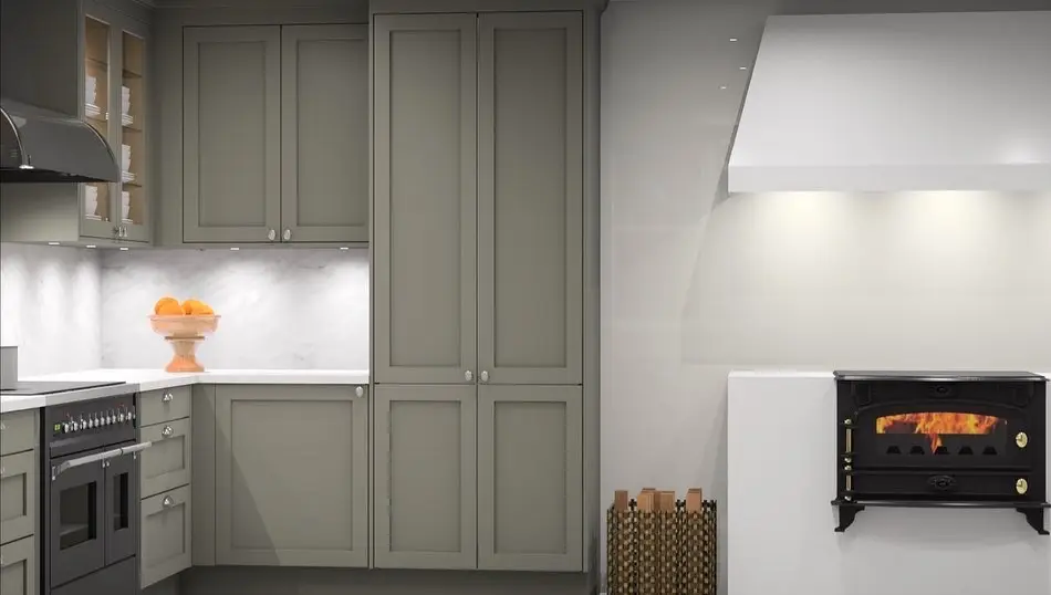 Lackerade möblerna i en grågrön nyans ger en elegant färgstarkhet till rummet utan att offra dess sobra stämning. De två ugnarna – en traditionell ugn och en vedugn – ger en sofistikerad touch som inte vanligtvis finns i moderna hem.