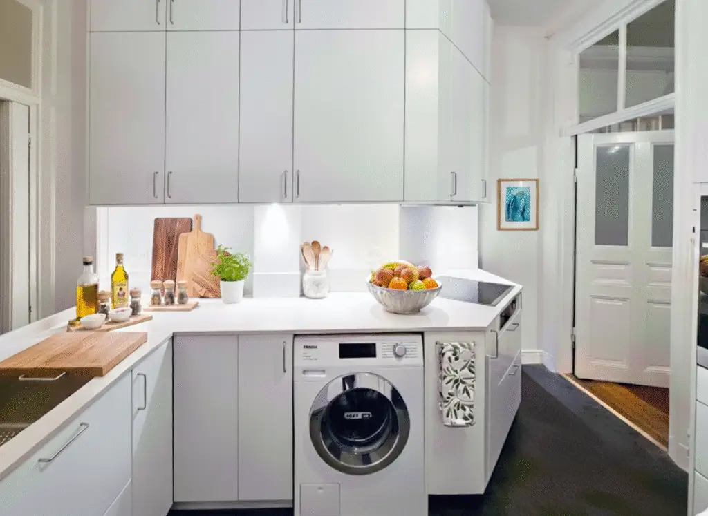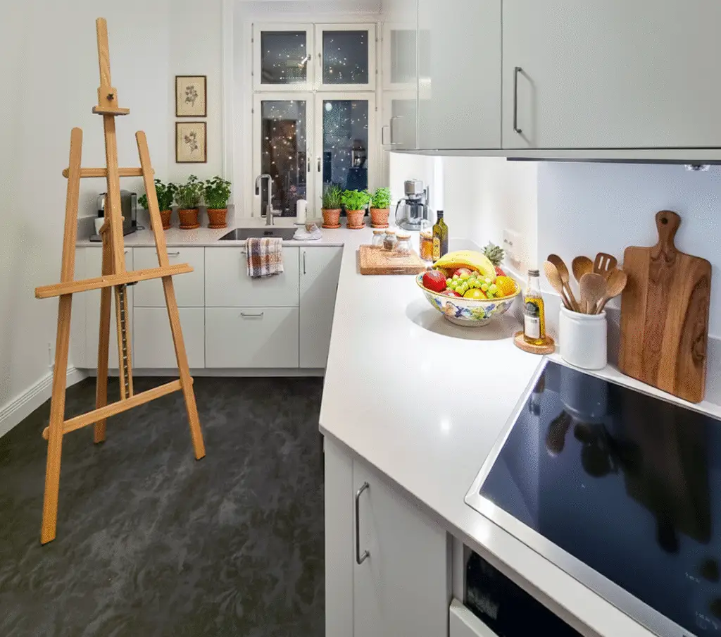 Ett litet kök med stora utmaningar. En totalrenovering av köket skulle göras och önskemålen var många. Tvättmaskin skulle få plats. En konstnärshörna och en matplats. Mycket förvaring och ett bra flöde för matlagning.
