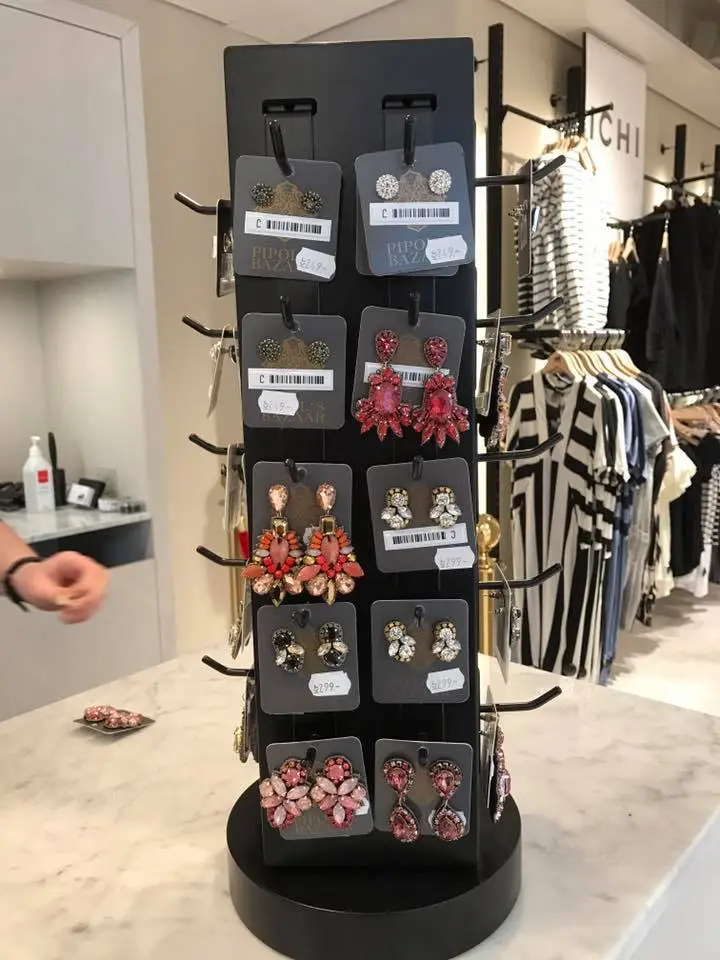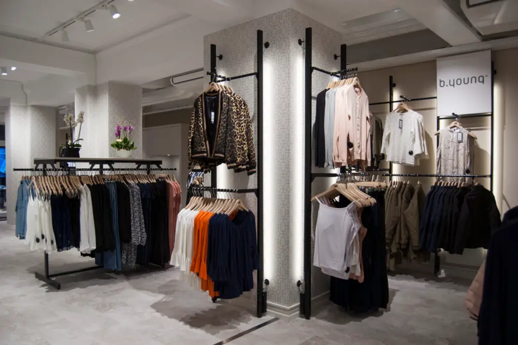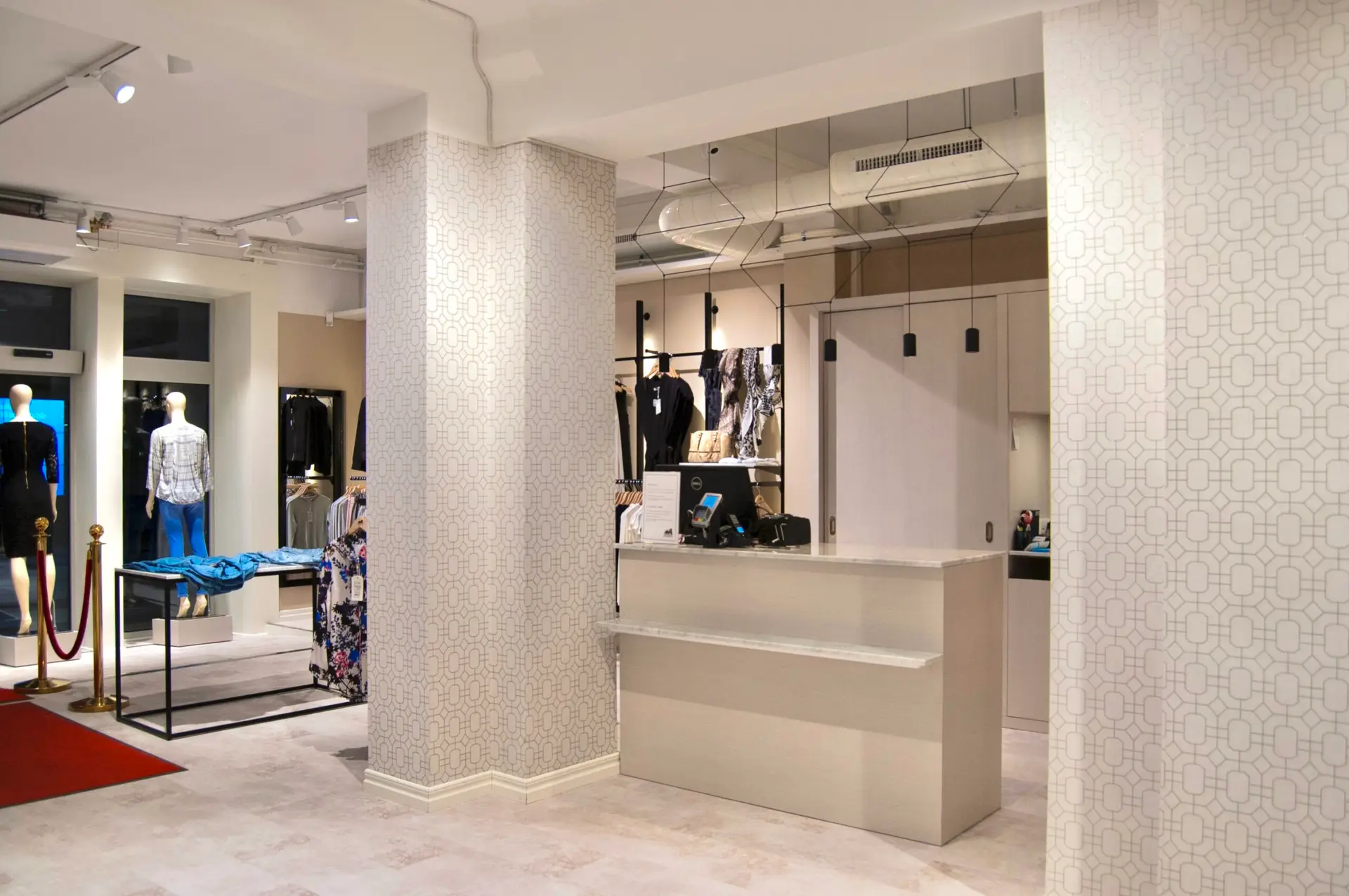 Inredningen anpassades i material, design och funktion för att skapa en samhörighet med kläderna. Även produktställ för smycken och accessoarer ritades.