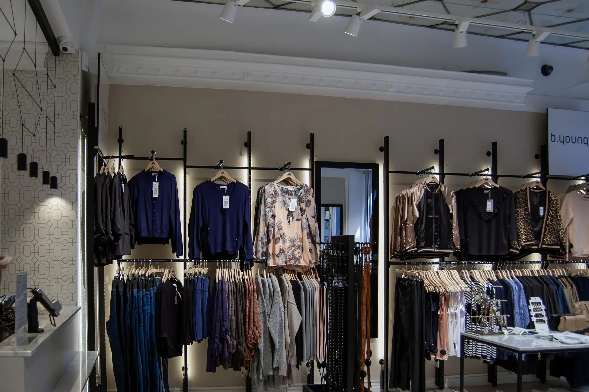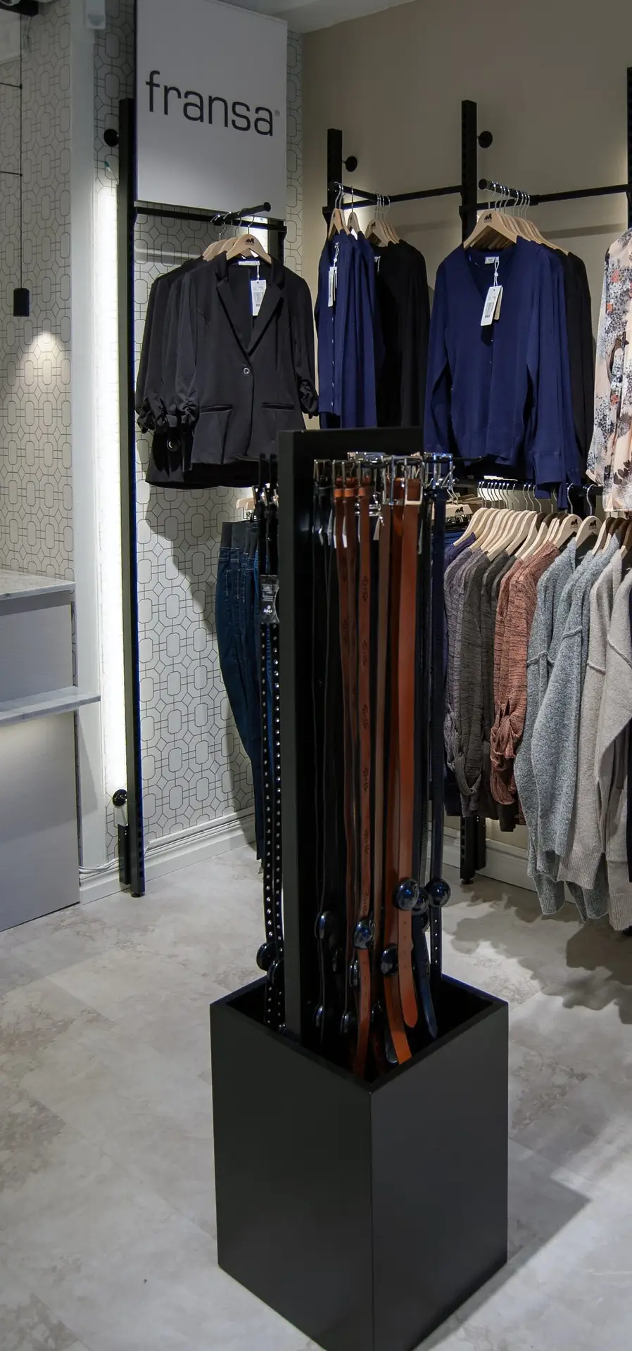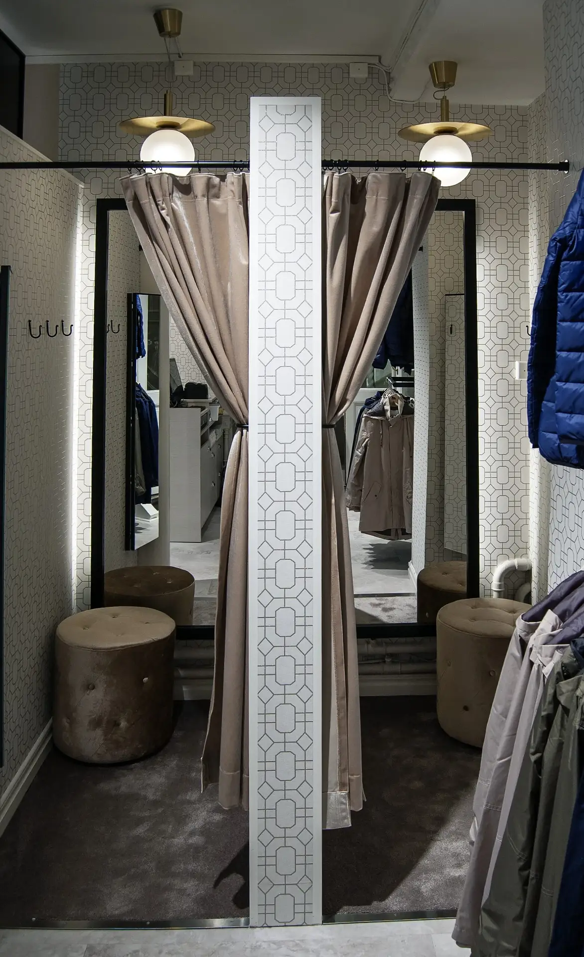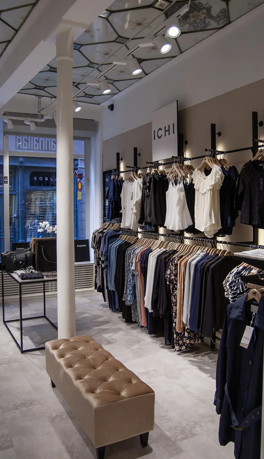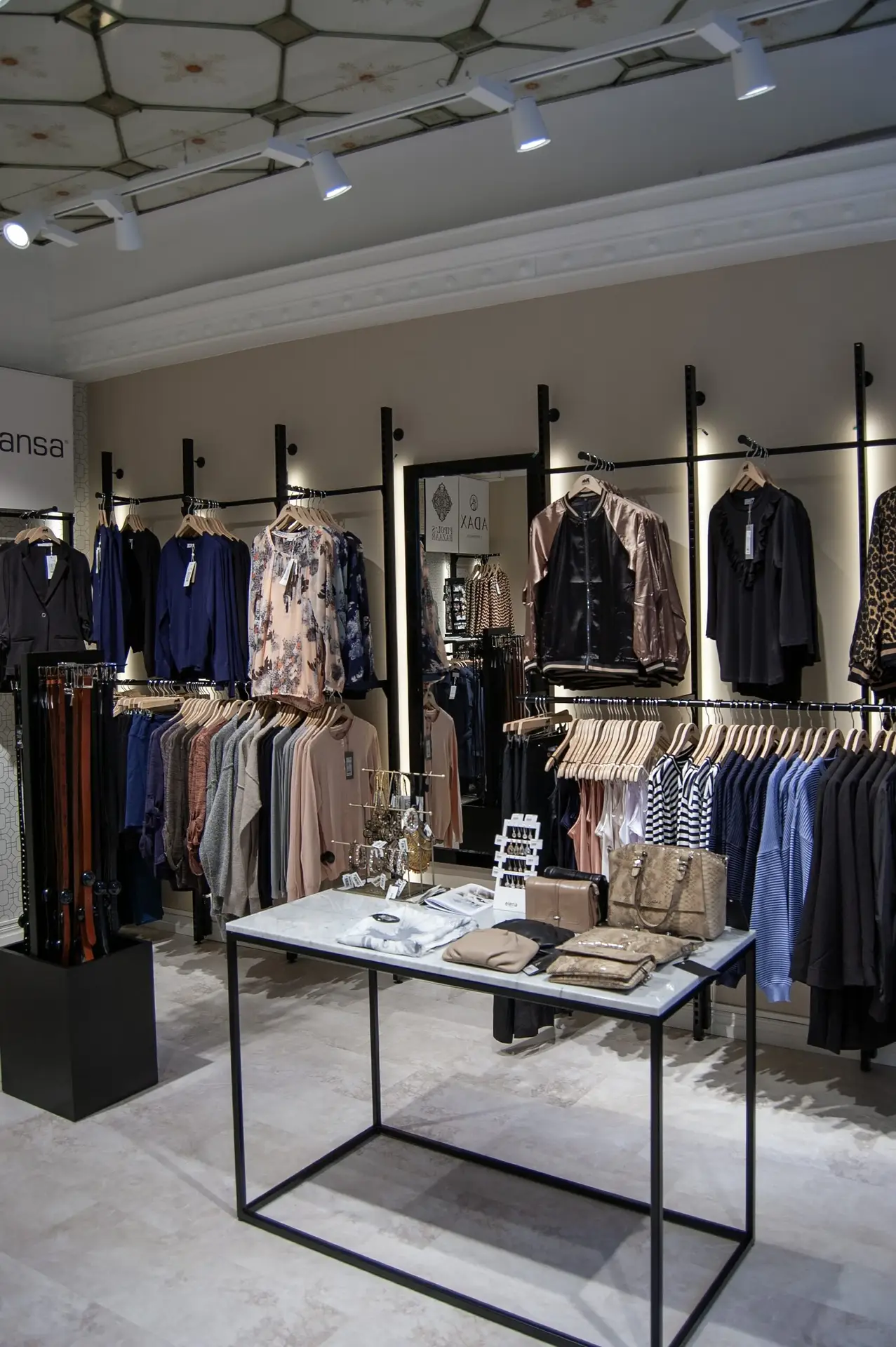 Klädstängerna monterades på distanser från väggarna, med integrerad LED-belysning som framhäver både plaggen och den eleganta geometrin i rummet. Resultatet blev en butik med en varm, feminin atmosfär – där historia möter modern design.