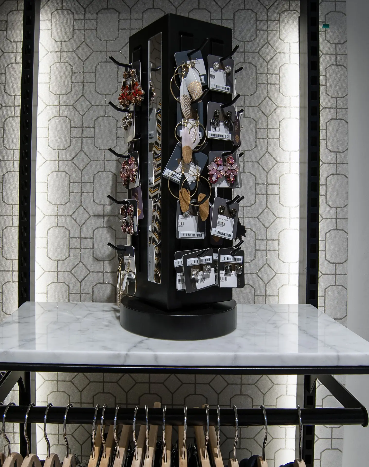 Även produktställ för smycken och accessoarer ritades och tillverkades särskilt för butiken.